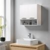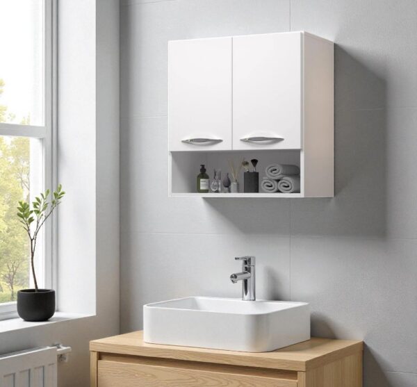 Модерен и функционален бањарски елемент во бела боја, дизајниран да внесе стил, практичност и уреден изглед во бањата.