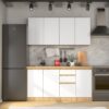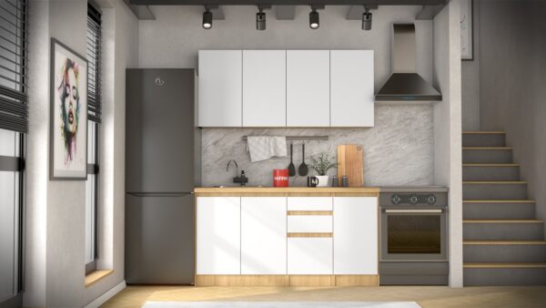 Модерен и функционален кујнски сет во сонома/ бела боја, дизајниран да внесе стил, практичност и уреден изглед во кујната.