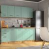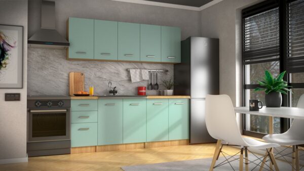 Модерен и функционален кујнски сет во сонома/ минт боја, дизајниран да внесе стил, практичност и уреден изглед во кујната.