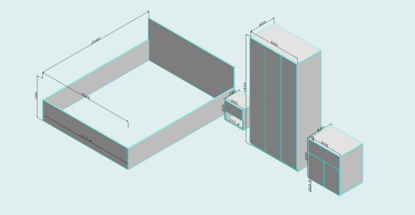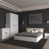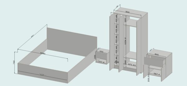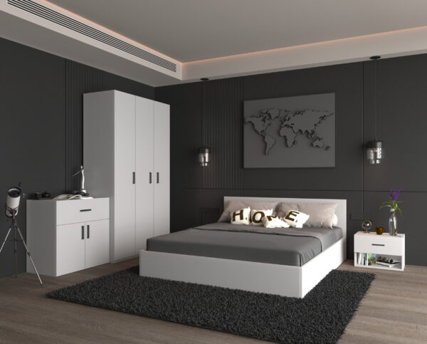 Модерен и функционален сет за спална соба во бела боја, дизајниран да внесе стил, практичност и уреден изглед во спалната соба.