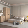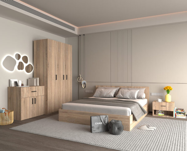 Модерен и функционален сет за спална соба во сонома боја, дизајниран да внесе стил, практичност и уреден изглед во спалната соба.
