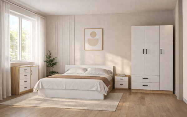 Модерен и функционален сет за спална соба во атлантик / бела боја, дизајниран да внесе стил, практичност и уреден изглед во спалната соба.