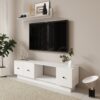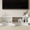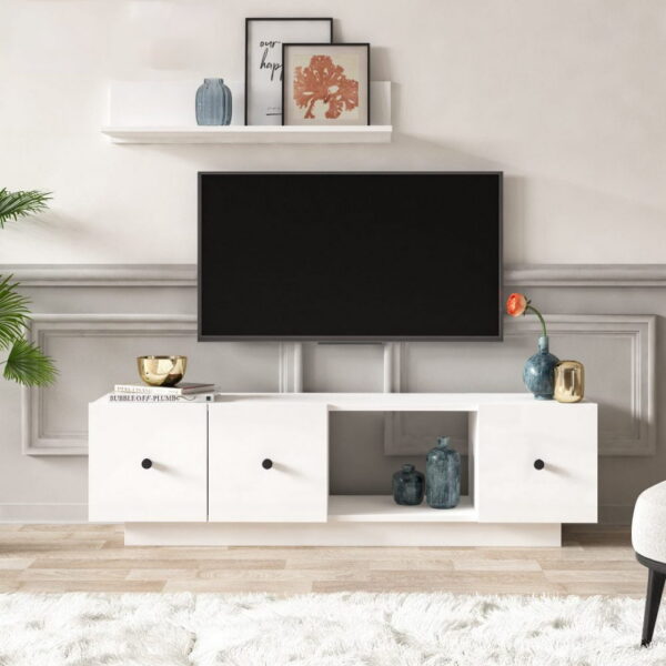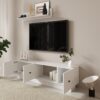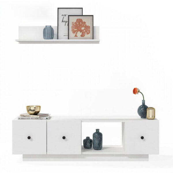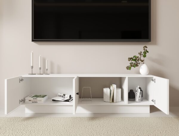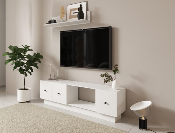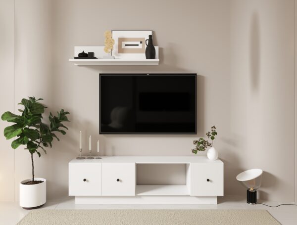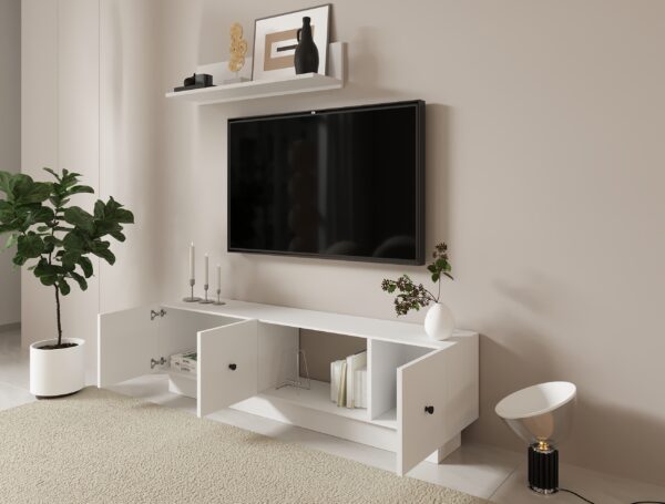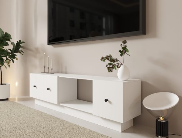 Модерна и функционална ТВ комода во бела боја, дизајнирана да внесе стил, практичност и уреден изглед во дневниот простор.