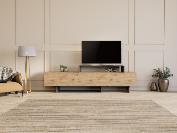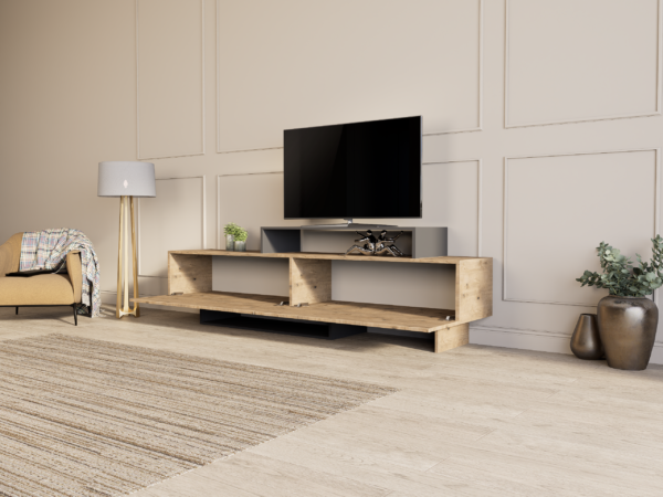 Идеална е за ТВ уред, мултимедија и дополнителни предмети, при што создава впечаток на хармонија, функционалност и визуелна уредност во просторот.