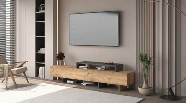 Модерна и функционална ТВ комода во атлантик / антрацит боја, дизајнирана да внесе стил, практичност и уреден изглед во дневниот простор.