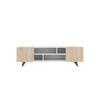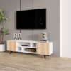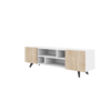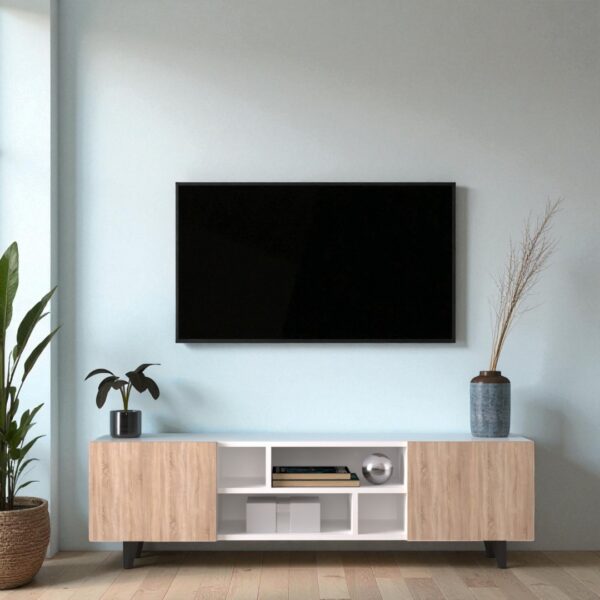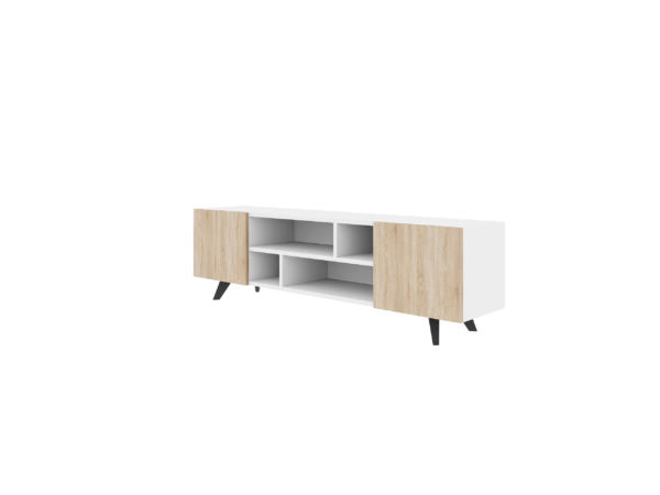 Модерна и функционална ТВ комода во бела / сонома боја, дизајнирана да внесе стил, практичност и уреден изглед во дневниот простор.
