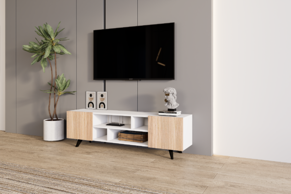 Идеална е за ТВ уред, мултимедија и дополнителни предмети, при што создава впечаток на хармонија, функционалност и визуелна уредност во просторот.